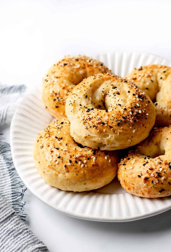 Brug ingredienser ved stuetemperatur og blend hytteosten, indtil den er glat for at opnå det bedste resultat. Lad dejen hvile, inden den formes, for at forbedre teksturen. Opbevar bagels i køleskabet i op til 4 dage eller frys dem i op til 2 måneder. Top med kerner eller krydderier for variation.
