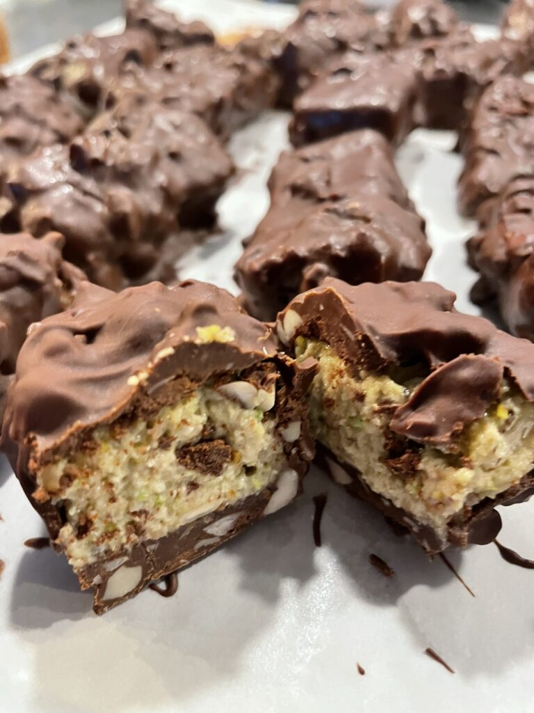 Dette er den ultimative frosne dessertoplevelse! Disse Pistacie-Isbarer er en sand nydelse – den sunde måde. Baren består af en blød, nøddeagtig og fløjlsblød frossen kerne, lavet med ægte pistacienødder og cremet kokos, som indkapsles i en sprød chokoladeskal, der knaser ved hver bid.