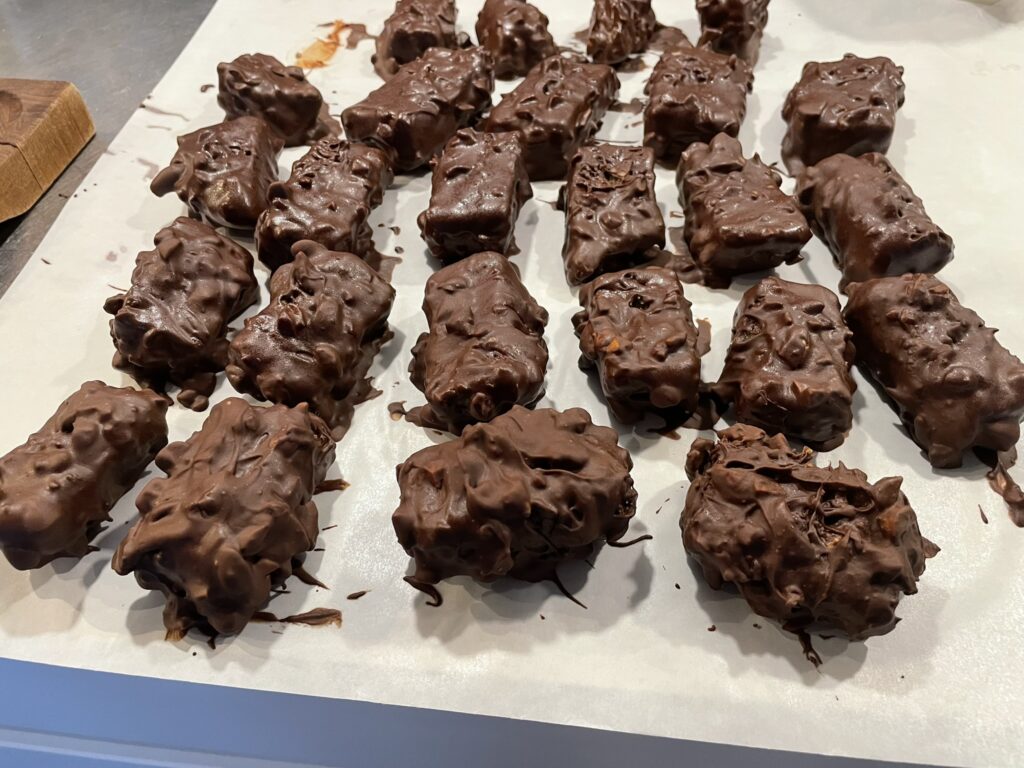 Stil barerne tilbage i fryseren i cirka 30 minutter, indtil chokoladeskallen er helt hård og knasende.